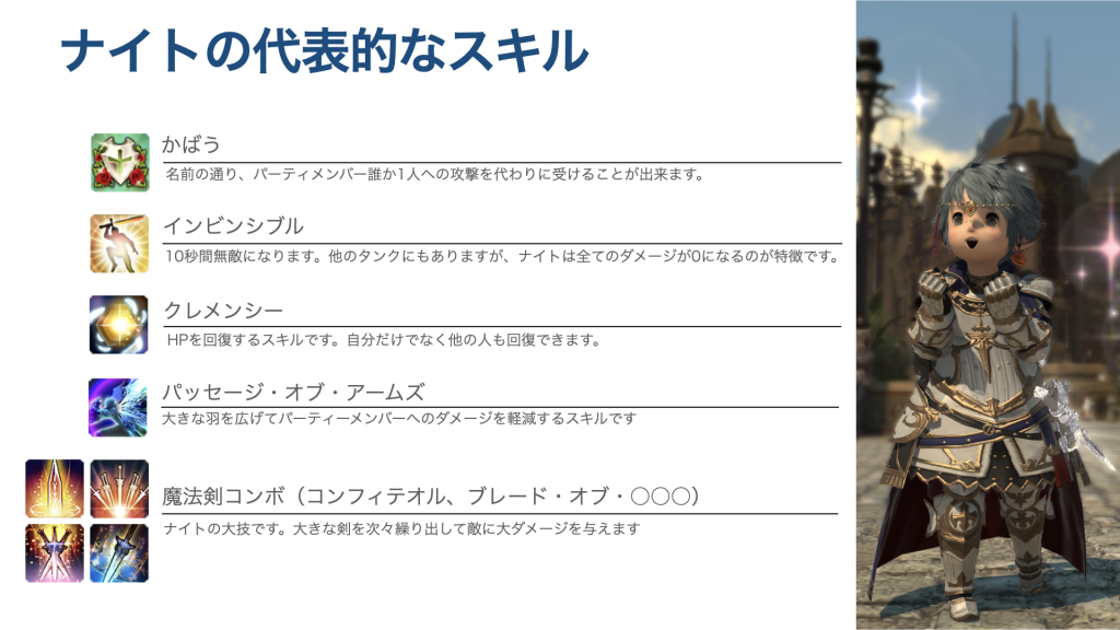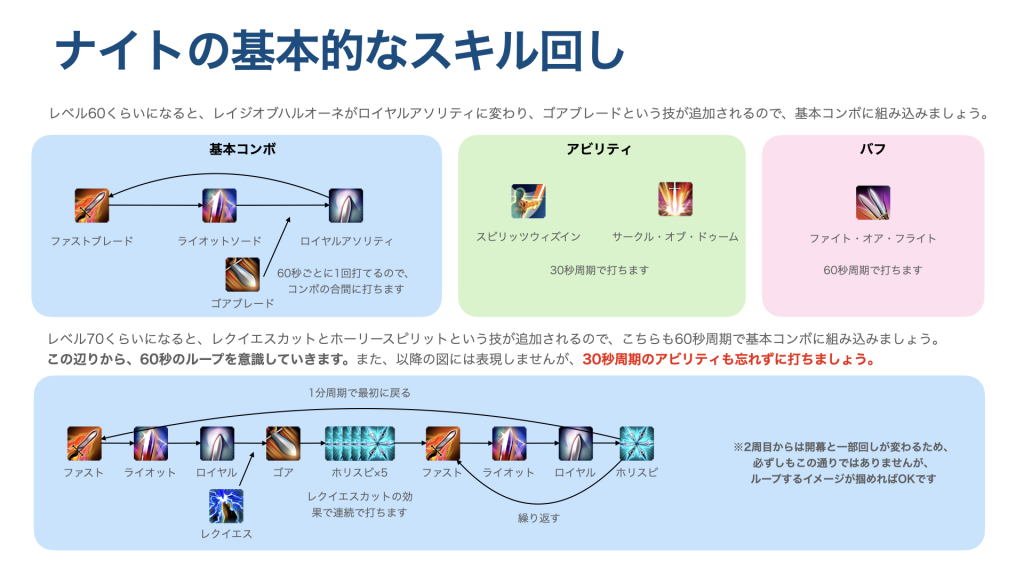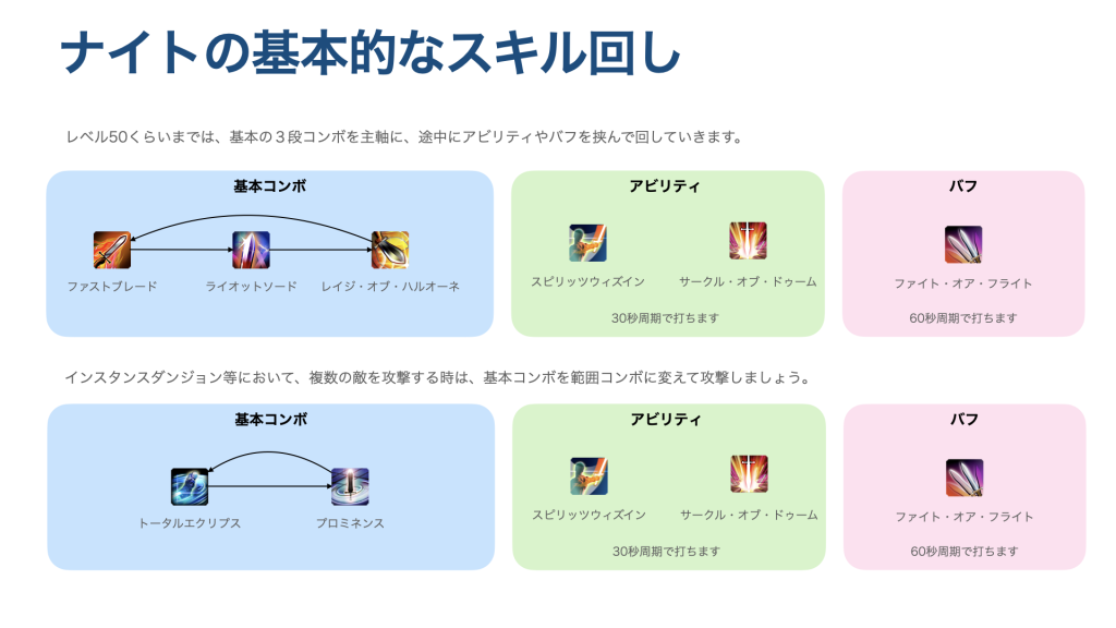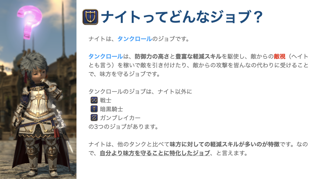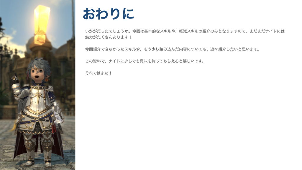 中身はジョブガイドとか、各種攻略サイト、ナイト上級者な方々のLodestone日記に載ってるような基本的な内容しかないですが、見てくれには少しこだわってみました。