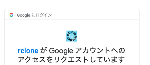 ブラウザで認証するか聞かれるので、y を入力します。するとブラウザが立ち上がりGoogle認証画面に行くので、設定するGoogleアカウントでログインして、↓の画面でrcloneのアクセスを許可します。