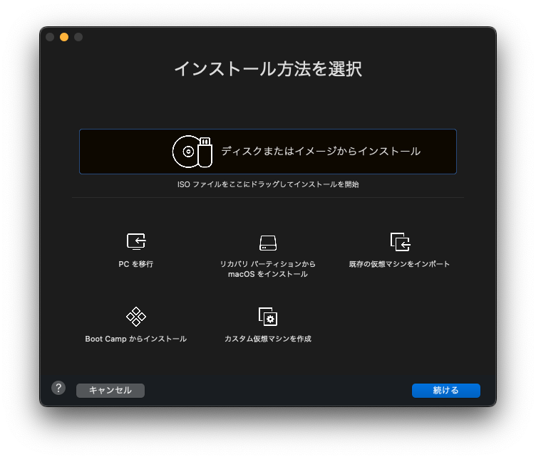 ここからインストールを始めていきます。まずはVMware Fusionの起動です。起動したら、”ディスクまたはイメージからインストール”にダウンロードしたESXiのISOファイルをドラッグします。