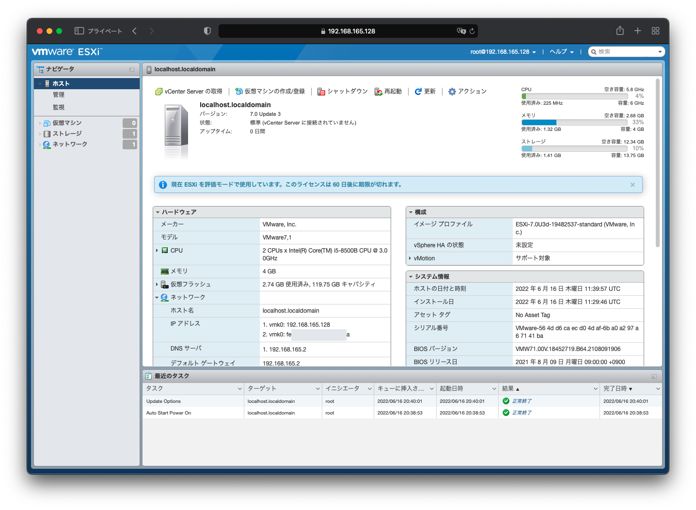 再起動が終わるとESXiが起動します。http://~に管理画面へ接続するアドレスが表示されているので、仮想マシンを実行している端末のブラウザからアクセスします。